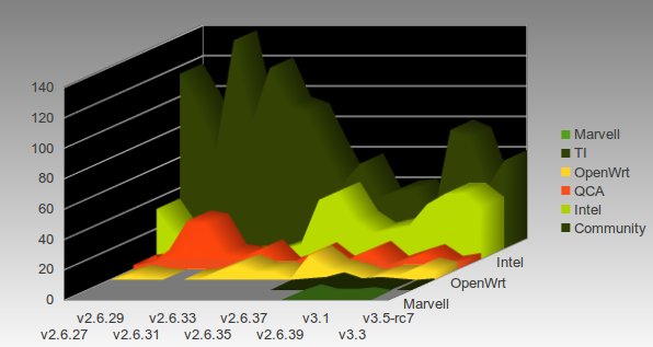 And now the short analysis: Intel started doing most of the development, later on Atheros (now known as Qualcomm Atheros or QCA) picked up some serious development. Intel later hired Johannes Berg and well that obviously accounts for Intel's huge spike in contributions and the decline in the community's contributions ;) What's nice towards the end is the increase from other organizations like TI and Marvell. The community also always manages to find its new contributors and always leads the development effort even with most 802.11 hackers already being hired at most corporations.