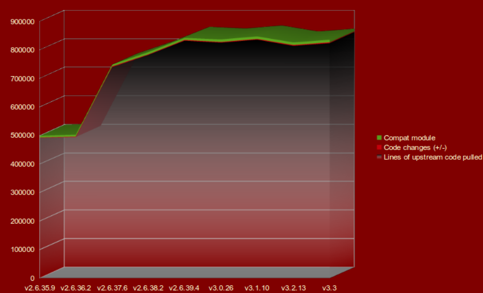 A few people like the strategy and thanks to all the help of a good large group of contributors today I can say we are striving towards these optimizations slowly. This effort started through the compat and compat-wireless (now renamed to compat-drivers) projects but the number of systems we backport keeps growing and the amount of code we can share keeps growing as well. Below exactly how much code we share is illustrated against the amount of code we are pulling directly from the Linux kernel.