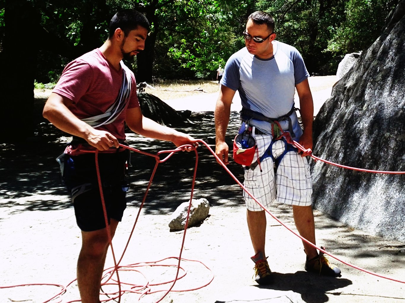 Chirstian Rozo was our couchsurfing host, we crashed at his cabin for employees at Curry Village. Couchsurfing lets you ask people online to crash at their place for free and you can also host. I've hosted and this would be my first time surfing. I highly recommend it to anyone looking to travel cheaply and that want to meet people and different cultures. I also believe that couchsurfing is likley one of those things that human anthropologists never expected: contrary to all the garbage the media feeds you about people only wanting to kill each other couchsurfing reveals that there are good amount of people that can be good and that they can be trusted, to the extent some of these same folks are willing to let strangers into their home, at times for a few days. Christian was nice enough to give me good tips for the park, and even showed me how to rappel down a rope, he introduced me to other employees at the park and I got to party a bit with them. My couchsurfing trip to Yosemite was dedicated to what I call rock climbing reconnaissance: familiarizing yourself with the area, picking up climbing guides, topos, meeting local rock climbers, anything that can help for gaining confidence for a future trip. I had read through my guidebooks and decided to scope out a few areas I figured would be good targets for my first climbs, either then or for a future trip.